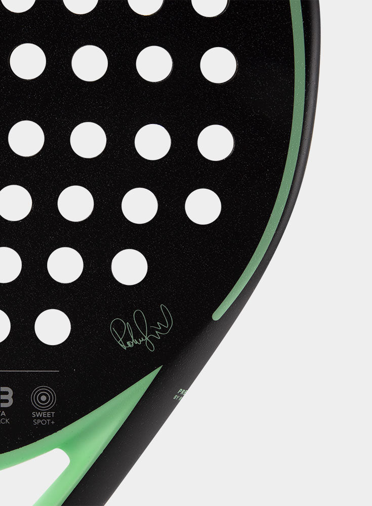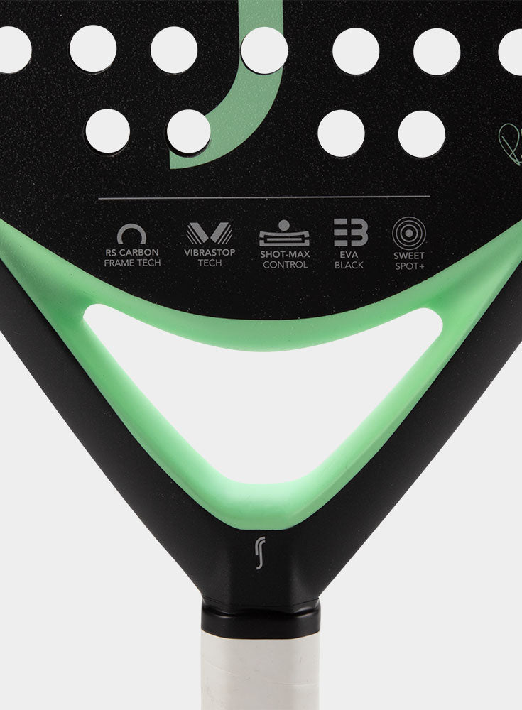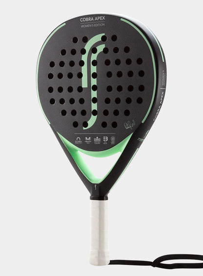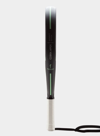 RS Cobra Apex Womens Edition Mint Padelbat. Cobra Apex er det mest stabile og samtidig kraftfulde bat i Cobra Serien fra RS. Opbygningen er med en ramme af carbon, der giver stabilitet og sikkerhed i battet. Overfladen er i japansk glasfiber, som gør battet tilgivende. Denne tilgivende overflade sammen med battets lette vægt på 350gr gør battet let at spille med. Denne kombination gør, at battet kan bruges af både den let øvede og turneringsspilleren.